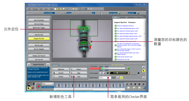 Checker 4G7C彩色视觉传感器还包含4G7系列所有其他广为人知的强大功能,包括能够将几乎所有的传感器工具添加到一项应用中。此外,Checker软件还让您能够轻松使用逻辑工具提供智能输出,以确定某个特殊元件是否通过检验。