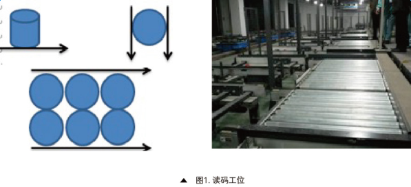 经过研究,出光润滑油决定在工厂回家物流线+追溯管理系统。工厂总共要改造4条线,每条线上需要有2个读码工位。另外,油桶直径为600mm,标签码是24mil的QR码,360度任意张贴。读码工位如图1所示,现场单条线的流程示意图如图2所示。